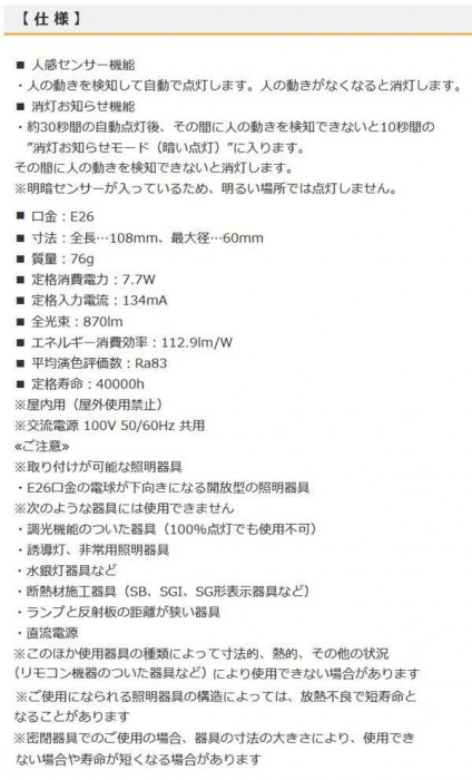 人感センサー機能付きのLED電球。