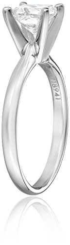 White gold engagement ring featuring princess-cut diamond in four-prong setting atop polished band;Made in the USA