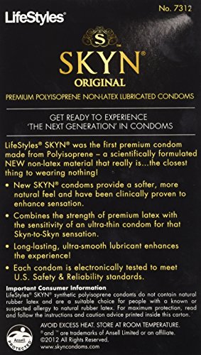 SKYN is the first premium condom made from polyisoprene: a scientifically formulated non-latex material that delivers the ultimate sensitivity that is the closest thing to wearing nothing. Polyisoprene material provides softer, more natural feel than latex that's clinically proven to enhance sensation. Combines the strength of premium latex with the sensitivity of an ultra thin condom for that Skyn-to-Skyn sensation. Ideal for people with latex allergies or latex sensitivity. Long-lasting, ultra smooth lubricant enhances the experience. Packaging may vary from images.Feature