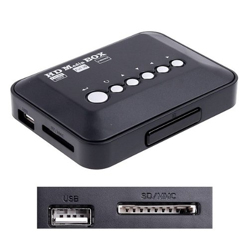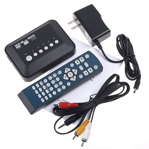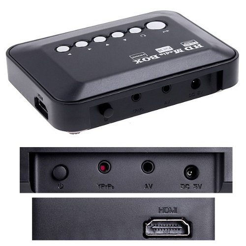 Features: Directly read SD card and USB hard disk, and play directly to TV, LCD & CRT. Rich video output interfaces, the real digital HDMI1.3 interfaces, YPrPb, AV. Support picture format: JPEG, BMP, GIF, PNG, etc. Support hard disk format: FAT16, FAT32, NTFS. File management functions can copy folders and files, delete, paste. For convenience, a remote control is provided. Easy-to-use button keys and full functional IR remote controller. Specifications: Input voltage: AC 180-260V, 50-60Hz Output voltage: DC 5V 2A USB interface: USB 2.0 Hard disk format: FAT16, FAT32, NTFS Supported hard disk: 2.5" / 3.5" SATA hard disk up to 2000GB, Mobile hard disk up to 2000GB Supported memory card: SD, MMC SDHC Video format: Real (RMVB/RM), H.264 (MKV/MOV/AVI), MPEG1-2-4 (DAT/VOB/AVi), WMV9/VC-1, H.264 AVI DIVX, 1920 * 1080 Video: RM, RMVB, AVI, DIVX, MKV, MOV, HDMOV, MP4, M4V, PMP, AVC, FLV, MPG, H.264, MPEG, WMV, VOB, DAT Audio: MP3, WMA, APE/FLAC, OGG, AC3, DTS, and AAC Picture: JPEG, BMP, GIF, PNG Output port: HDMI, YPrPb, AV Display mode: HDMI, VGA, AV output Remote control power supply: 2 * AAA batteries (not included) Power adapter input: 100-240V, 50-60Hz 0.3A Power adapter output: 5V 2A Box size: 11 * 8 * 3cm Box weight: 81g Package size: 25.1 * 16.2 * 5cm Package weight: 400g Package including: 1 * Media player 1 * Remote control 1 * Wire harness 1 * AC power adapter 1 * User manualFeature