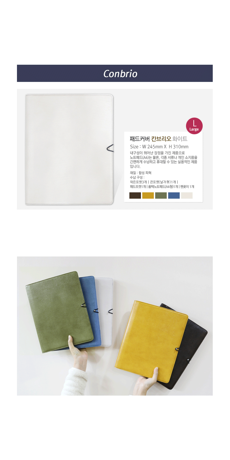 내구성이 뛰어난 장점을 가진 제품으로 노트패드(A4)는 물론, 각종 서류나 개인 소지품을 간편하게 수납하고 휴대할 수 있는 실용적인 제품입니다.