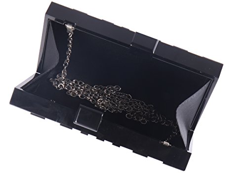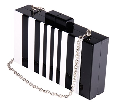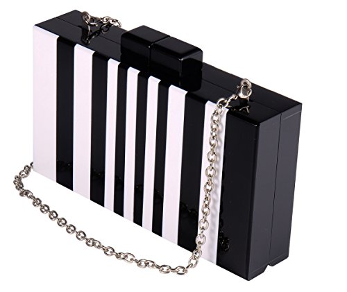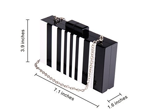 -. Feature : Unique black and white clutch: Made of high quality acrylic. Acrylic is a special material of women bags that insulates better than glass, potentially saving on heating bills. It comes with smooth surface, stylish and good designs, makes it unique and different from the other evening bags. / Multifunction black white handbag: This black clutch bag come in many different styles, like Cross-Body bags, purse ,evening clutches, shoulder bag, women handbag. I t great size for size for women of all ages in all season suitable appointments, shopping, wedding cocktail, party, work. / Handbags will be a perfect gift: High-quality selection and fine workmanship, each bag into a near-perfect works of art, exudes a strong artistic atmosphere. The silver chain strap gives a hint of elegance. Striped pattern looks cute and fashion. Perfect gifts for girl friend, lady, striped lovers. / Large Capacity: This acrylic purse has professional size of Length 7.1" x Width 1.6" x Height 4.5". This clutch handbag is rectangular hard body and it has large inside capacity which easily put your sunglasses, lipstick and makeup in it, and the internal pocket is large enough for iPhone6 Plus. / 100% Satisfaction and Guarantee: If you are not satisfied in 30 days, we refund you. If you have any question, please post into "Customer Questions & Answers" at the bottom of this page. You will get the answer by us or buyers asap.