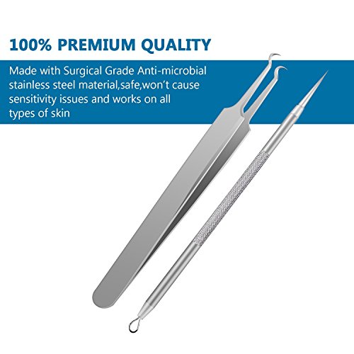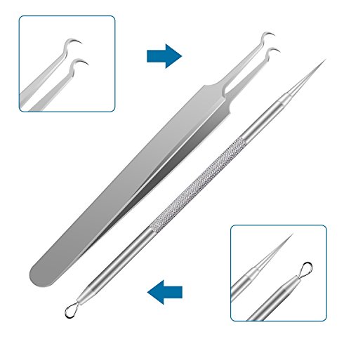 Say goodbye to blackhead and pimples with Syncmarket Premium Blackhead Removal Kit! All tools are made with high quality Stainless steel which prevents corrosion and minimizes the risk of infections. Pointed tip tweezer is great for ingrown hairs and popping pimples easily. Perfectly aligned for precise plucking. Extractor with different size loops on each end will swiftly and effectively get rid of your pesky blackheads with no irritation. Comes with a convenient travel case.Feature