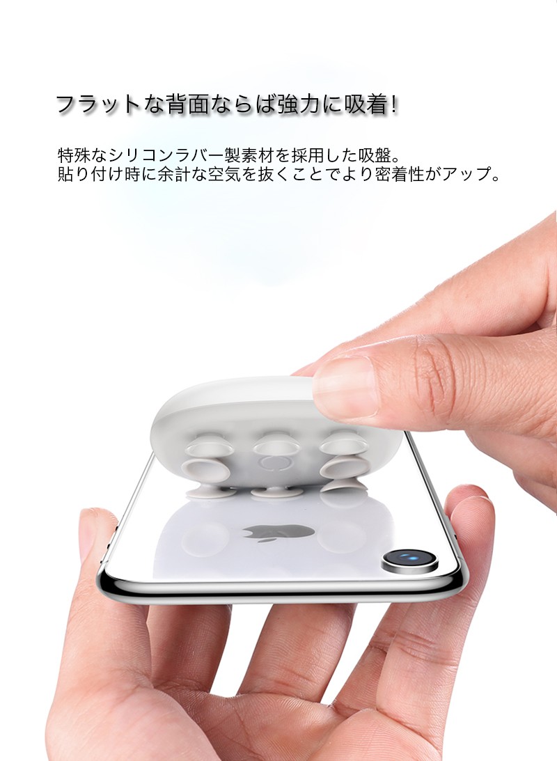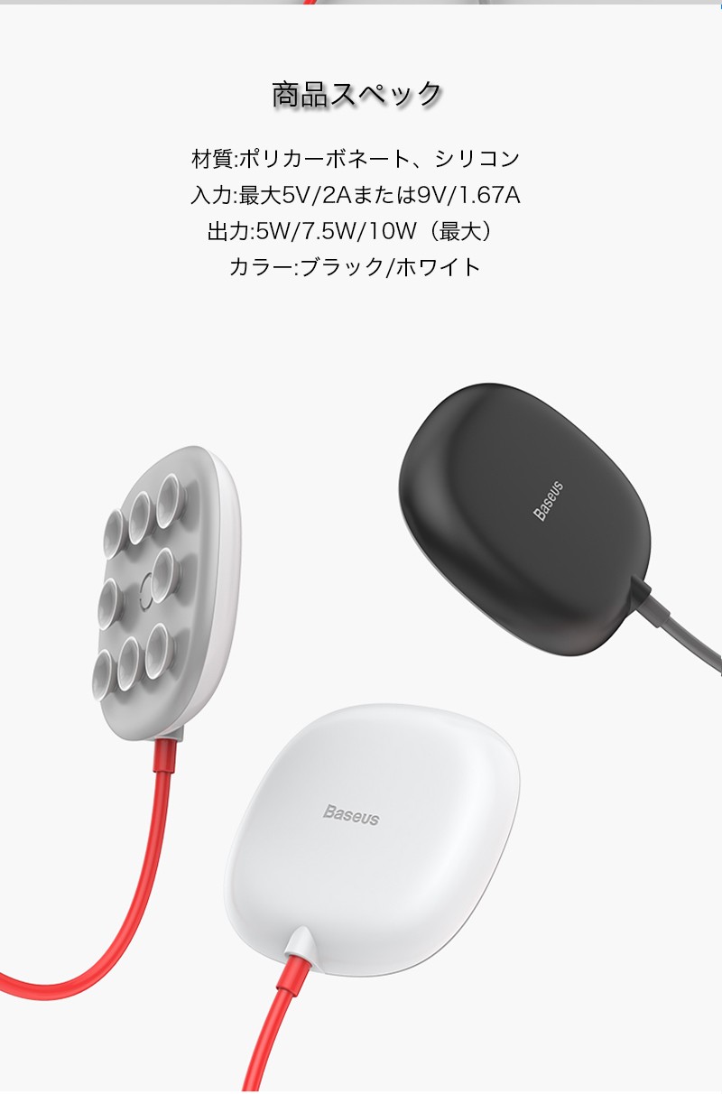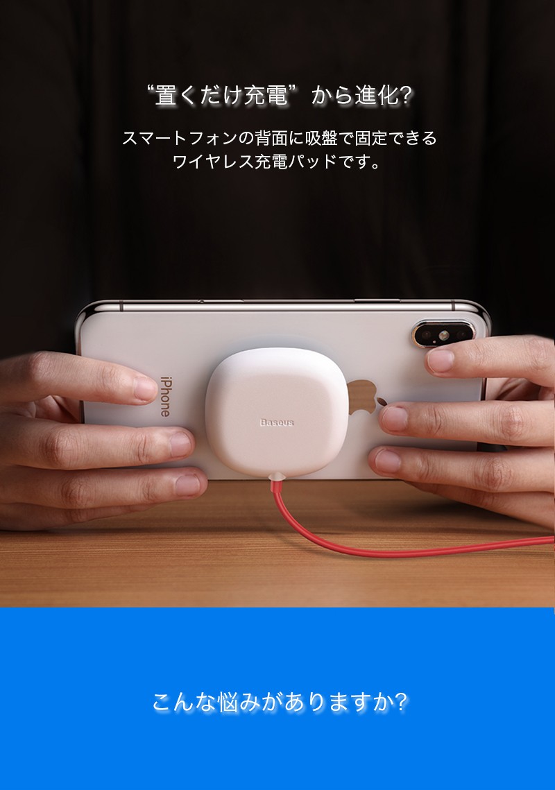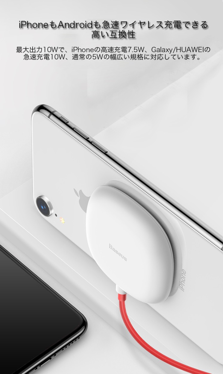 ★「対応機種」iPhoneXS、iPhoneXS Max、iPhoneXR、iPhoneX、iPhone8、iPhone8 Plus、GALAXY S8、GALAXY S8+、GALAXY S9、GALAXY S9+、Xperia XZ3、Xperia XZ2、Xperia XZ2Premium等Qi規格対応の機種適用★「カラー」ブラック(黒)、ホワイト(白)★「商品特徴」“置くだけ充電”から進化!スマートフォンの背面に吸盤で固定できるワイヤレス充電パッドです。ゲル吸盤内を真空状態にし、しっかり固定することができ、取り付けも簡単です。最大出力10Wで、iPhoneの高速充電7.5W、Galaxy/HUAWEIの急速充電10W、通常の5Wの幅広い規格に対応しています。★「キーワード」ワイヤレス充電器 吸盤式 急速充電対応 Qi規格対応 iPhone Galaxy Xperia アイホン ギャラクシー エクスペリア USB電源式 高温防止 ゲーム 最適 コンパクト おしゃれ スリム シリコン ポリカーボネート