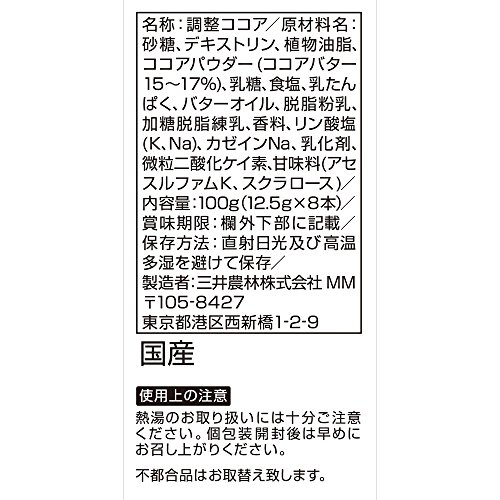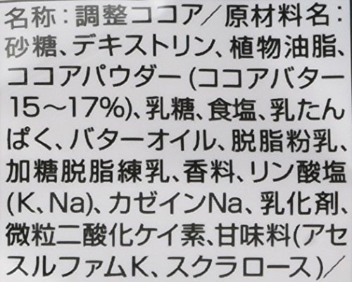 원재료:설탕,덱스트린,식물성 기름지,코코아 파우더(코코아 버터15~17%)고, 유당,식염,유담백,버터 오일,탈지분유,가당탈지연유,향료,인산염(K,Na)고, (Kasein)카세인Na,유화 제,미립2산화 규소,감미료(assessment《루후무》K,《스쿠라로스》)