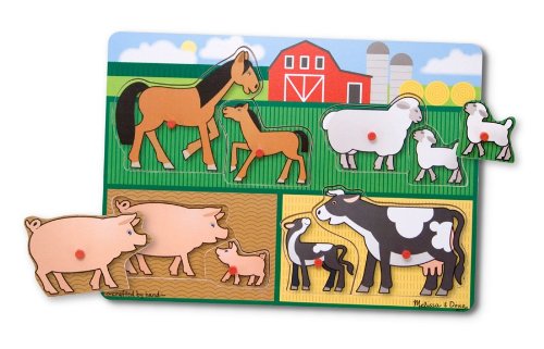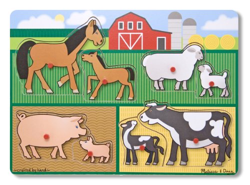 Studio : Melissa Doug Publisher : Melissa Doug Binding : Toy Product Description Your child may be inspired to "moo, oink, baa and neigh" while matching the mother and baby animals in this kid-powered wooden puzzle! Easy-grasp pegs and pictures under the pieces make this a great way to practice hand-eye, fine motor and memory skills. 0