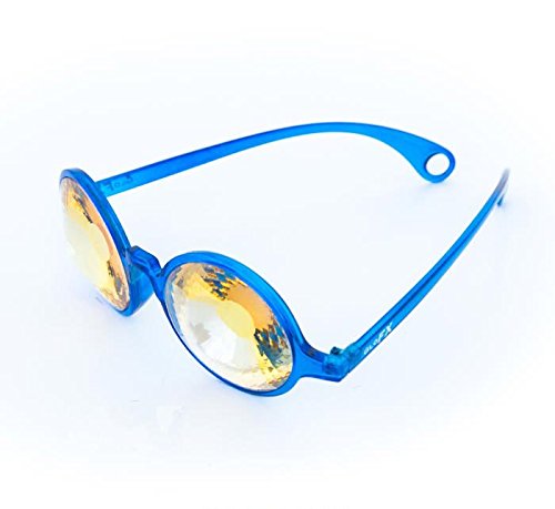 These lenses are set in an exclusive blue transparent frame and each pair comes with a free microfiber cleaning case. As with all of our products, Transparent Blue Kaleidoscope Glasses with Gold Wormhole Kaleidoscopic Lenses are painstakingly made by hand, assuring that each pair of glasses is of the highest quality.