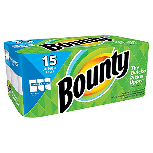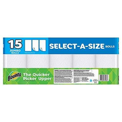 -. Binding : Health and Beauty -. Brand : Bounty -. Feature : 2x more absorbent so the roll can last longer* / Choosing your sheet size with Bounty Select-A-Size lets you use less / The Quicker Picker Upper is 2x more absorbent* so you can use less -. IsAdultProduct : 0 -. Label : Bounty -. Manufacturer : Bounty -. MPN : 980033575 -. PartNumber : 980033575 -. ProductGroup : Health and Beauty -. ProductTypeName : HEALTH_PERSONAL_CARE -. Publisher : Bounty -. Studio : Bounty -. Title : Bounty Select-A-Size Paper Towels 15 Jumbo Rolls