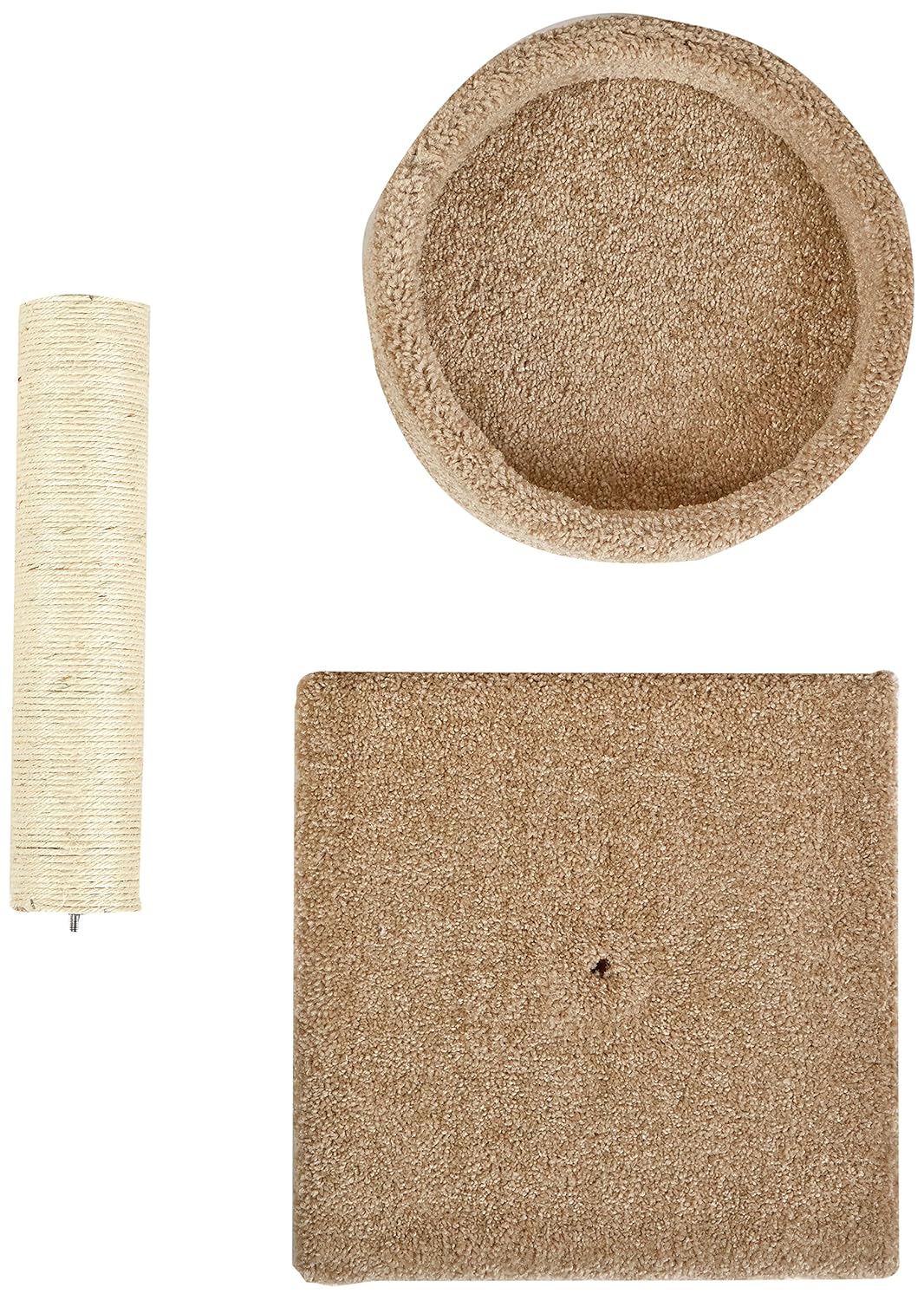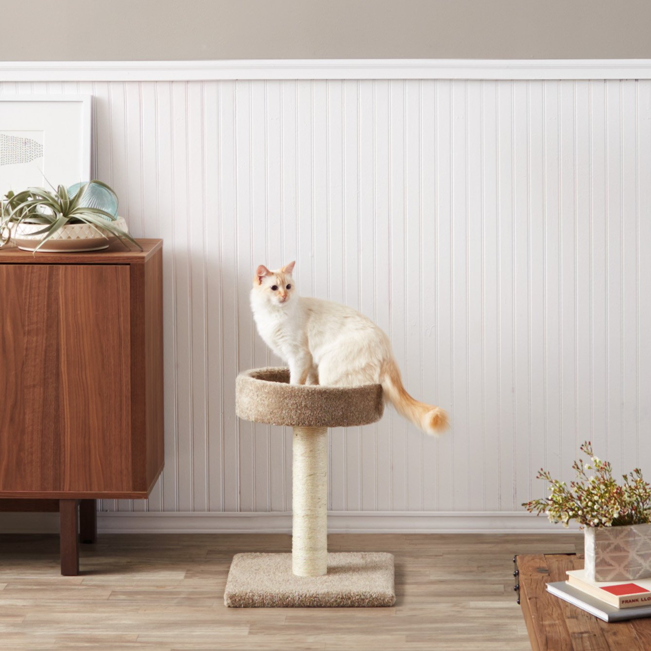 室内用キャットタワー。1段の足場と、麻のロープが巻かれた1本の爪とぎポール