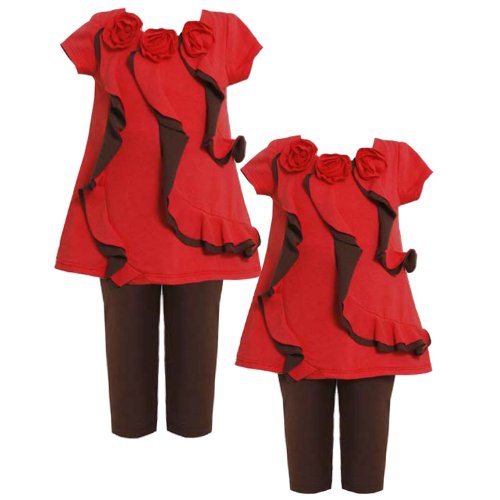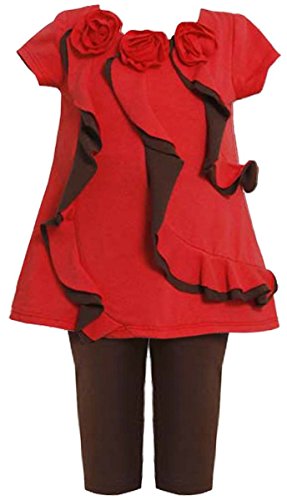-. Binding : Apparel -. Brand : Bonnie Jean -. Color : Red -. Department : baby-girls -. Feature : RED & BROWN KNIT DRESS & LEGGING SET features RED CAP-SLEEVE KNIT DRESS/TOP with RUFFLE DETAILS and TRIPLE ROSETTE ACCENT at the round neckline plus key hole button closure in back. / Pull-on BROWN KNIT LEGGING-PANTS features comfortable elastic waistband. / Matching/Coordinating sister styles available in sizes 3M-4T, search for style(s): BNJ-3862. / More baby & girl party dresses available, search for: "bnj-girl-party-dress " -. MPN : B53862 -. PartNumber : B53862 -. ProductGroup : Apparel -. ProductTypeName : DRESS -. Title : Bonnie Jean Baby 12M-24M Ruffle Front Triple Rosette Knit Dress/Legging Set