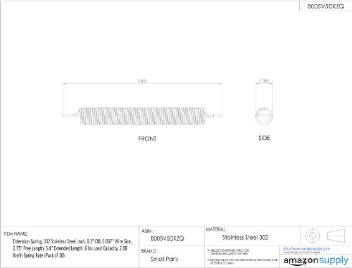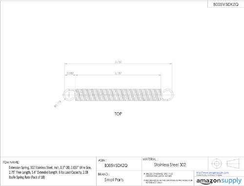 Extension Spring, 302 Stainless Steel, Inch, 0.3" OD, 0.037" Wire Size, 2.75" Free Length, 5.4" Extended Length, 6 lbs Load Capacity, 2.08 lbs/in Spring Rate (Pack of 10)