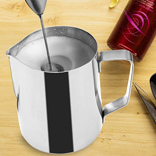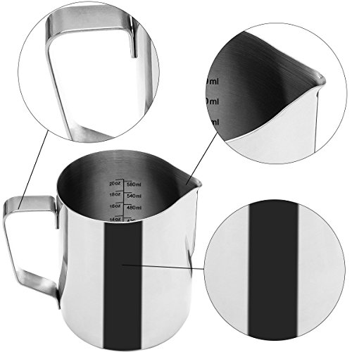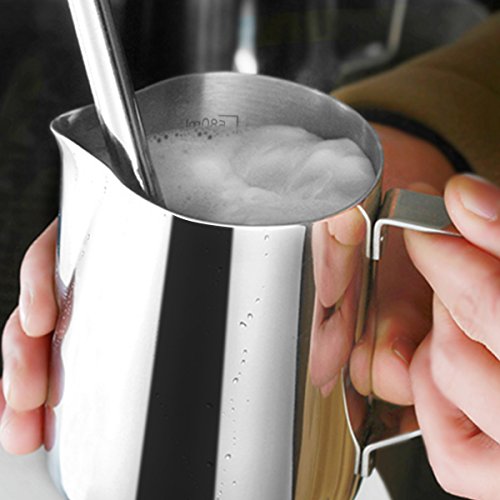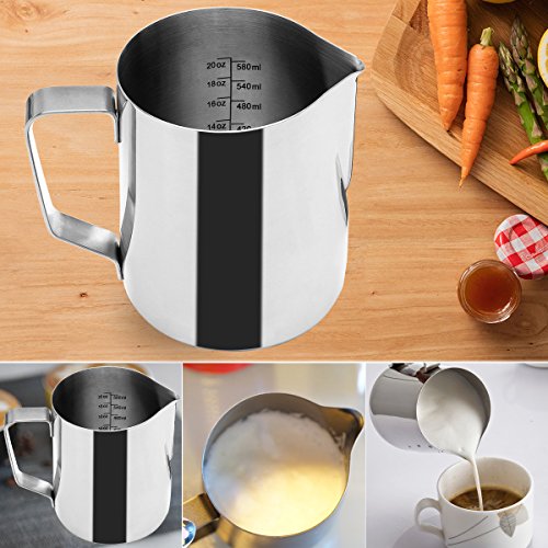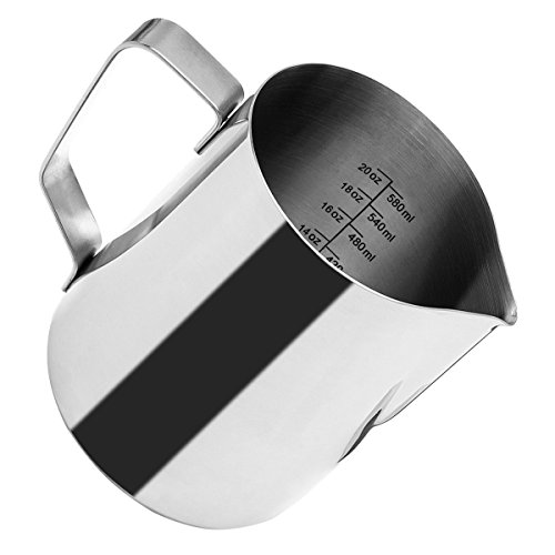 - ★GET CREAMY FROTH IN NO TIME: You can use it for frothing milk measuring other liquids or for serving cream or other beverages to your guests. If you want that creamy latte, hot coco or cappuccino with the foam on top this is the milk frothing pitcher for you. The ergonomic design makes it possible for anyone to use.