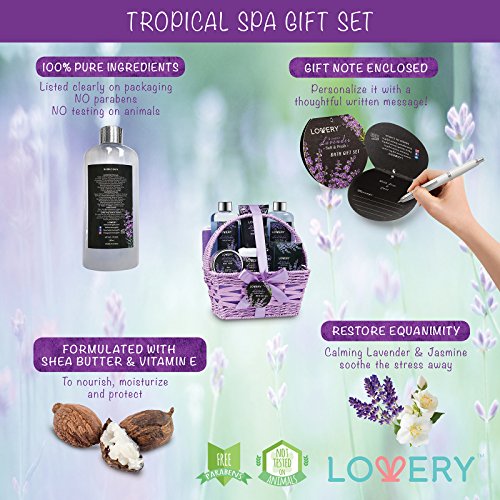 - COMPLETE SPA GIFT SET ❤ Restore your equanimity with a luxurious at-home spa treatment! Beautifully packaged in a charming woven basket, this bath gift set makes for an extraordinary gift, and adds a lovely touch to the bathroom. Contains a Shower Gel(180ml), Bubble Bath(180ml), Body Lotion(100ml), Bath Salt(100g), Body Scrub(50g), Lavender Massage Bath Oil(30g), Exfoliating Loofah Back Scrubber and a Purple Handmade Weaved Basket for décor and storage.