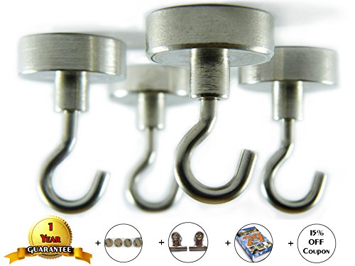Super Strong Neodymium Magnetic Hooks - Pack Of 4 - Command Strips Hooks Set - Picture Hanging - Heavy Duty - For Ceiling Grill BBQ Coat Earth Magnets Peg Board Tools - 4 FREE Bounuses
