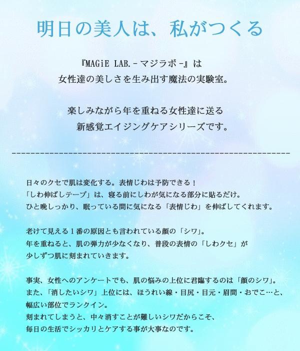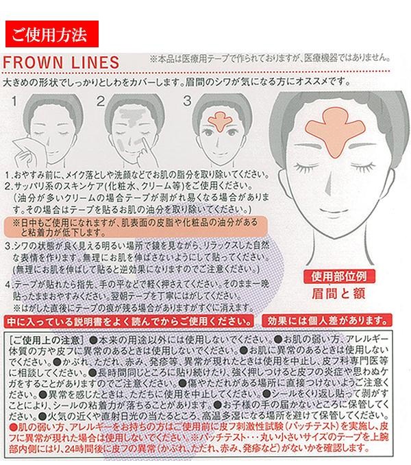 | 普段の表情のクセが少しずつ刻まれてできるのが「表情じわ」。しわ伸ばしテープは、ほどよく堅い医療用テープで皮膚を固定して、寝ている間に、しっかりと気になる「表情じわ」を伸ばしてくれます。寝る前にシワが気になる部分に貼るだけなので、毎日続けられる簡単ケア!!フラウンラインは、大きめの形状でしっかりとシワをカバーします。眉間のシワが気になる方にオススメ☆ |