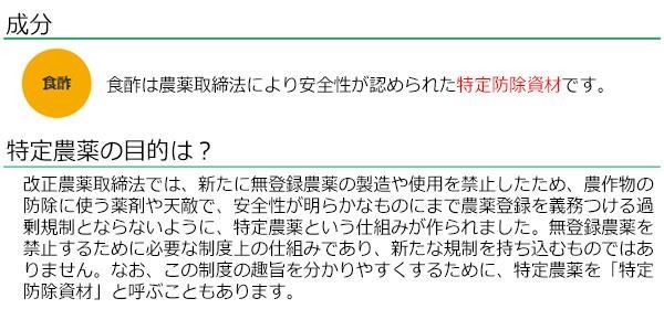 | 有効成分は100%食品成分であるお酢で作った除草剤です。お子様やペットのいる家でもご使用いただけます。成分が土壌に残留しにくく何度でも使用可能です。 |