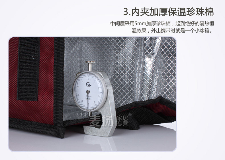 3) 中间层采用加厚保温珍珠棉,优质铝箔表层复合膜,保温时间更加长久;