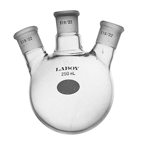 Laboy HMF011419 Glass 250 mL 3 Neck Round Bottom Boiling Flask with 19/22 Center and Side Joints Angled
