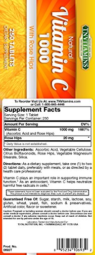 -. Binding : Health and Beauty -. Brand : TNVitamins -. EAN : 0095234106932 -. Feature : Each Tablet Contains 1000 mg. Of Pure, Natural Vitamin C With Rose Hips* / Vitamin C is a water-soluble vitamin* / You should have an ongoing supply of such vitamins in your diet.* / A Powerful Immune Boost* -. IsAdultProduct : 0 -. Label : Total Nutrition -. LegalDisclaimer : *Information provided is intended for general knowledge. It is not a substitute for professional medical advice or treatment for specific medical conditions. Always seek the advice of your physician or other qualified health care provider with questions you may have. This product has not been evaluated by The US FDA. and is not intended to diagnose, treat, cure or prevent any disease. -. Manufacturer : Total Nutrition -. MPN : 0693 -. PackageQuantity : 1 -. PartNumber : 0693 -. ProductGroup : Health and Beauty -. ProductTypeName : HEALTH_PERSONAL_CARE -. Publisher : Total Nutrition -. Size : 250 Tablets -. Studio : Total Nutrition -. Title : Vitamin C 1000 Rose Hips - 250 Tablets -. UPC : 095234106932