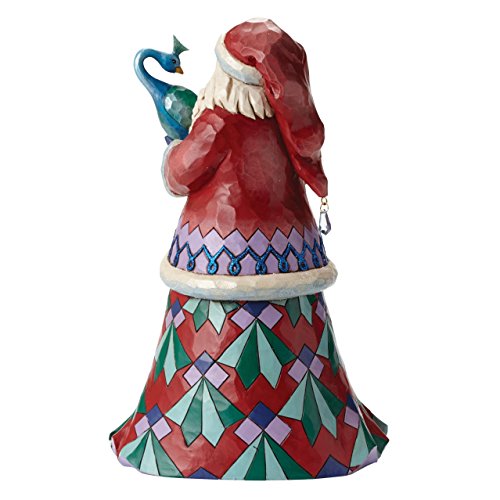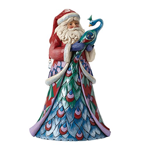 Jim shores winter Wonderland collection features eye-catching accents of brightly colored glitter and iridescent paint. This Santa with glorious Peacock is a beautiful holiday centerpiece intricately fashioned in jims unique Folk art style.Feature