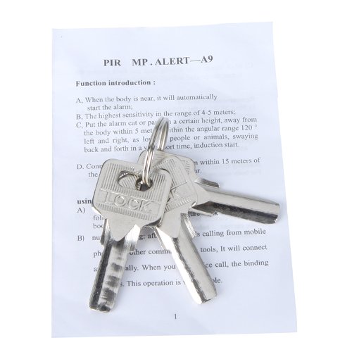 -. Feature : Combines locking function with alarming function. / Built-in movement triggered alarm, which can emit loud sound when the lock is hit or shaken. / Adopts MCU core procedures, high-tech integrated circuit and digital sensor chip. / Can be set to two states: mechanical lock and alarm.Low false alarm rate. Low power consumption. / Can be used on door, window, bicycle, container, motor bike, tricycle, pull gate, garden, etc.