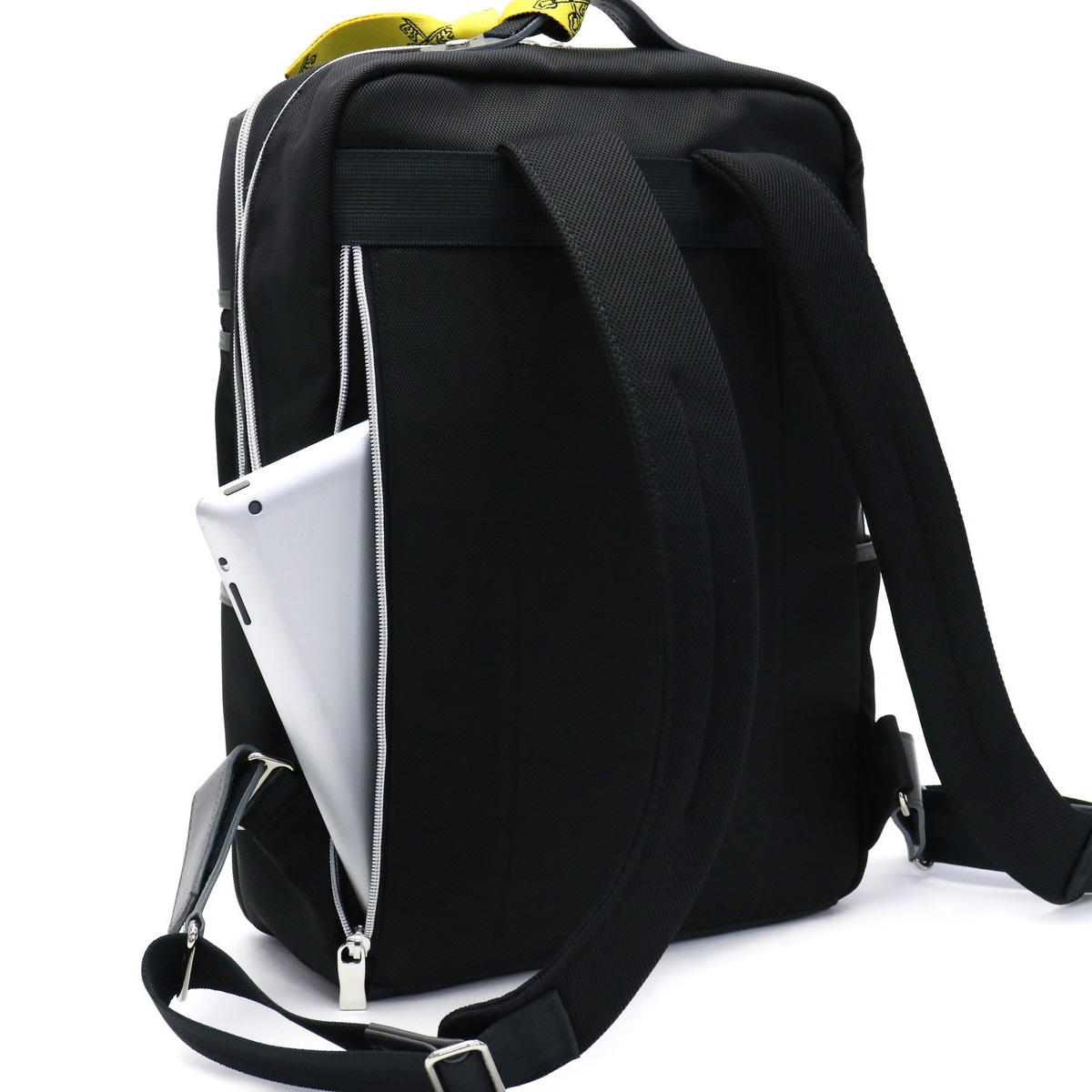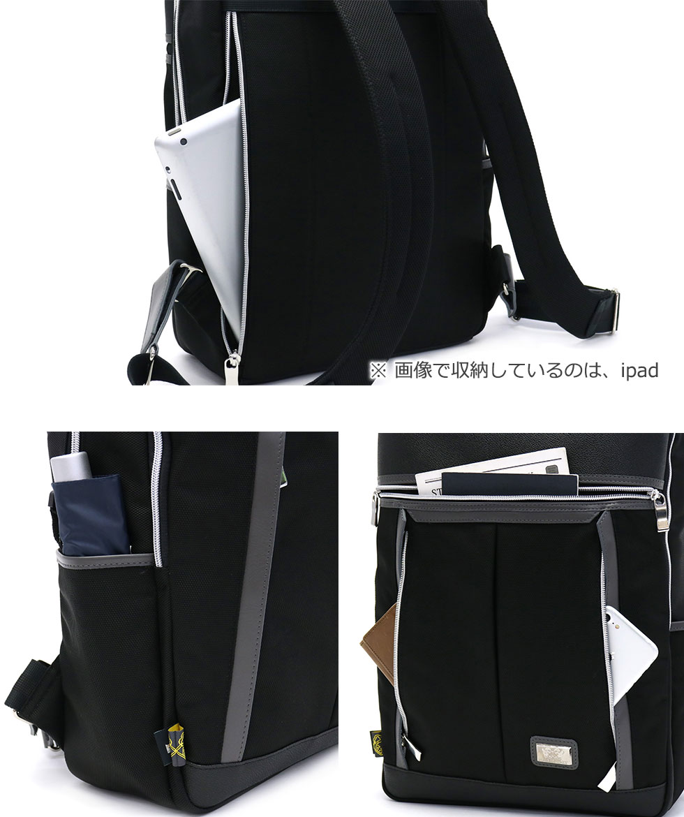 本体外側にも充実した収納機能を装備。背面側には小さめのPCやタブレットの収納に最適なクッション性のあるジップポケットを装備。また、フロント部やサイドにも複数のポケットを設け使用頻度の高いアイテムを種別に管理していただけます。
