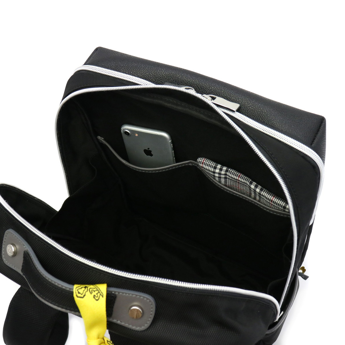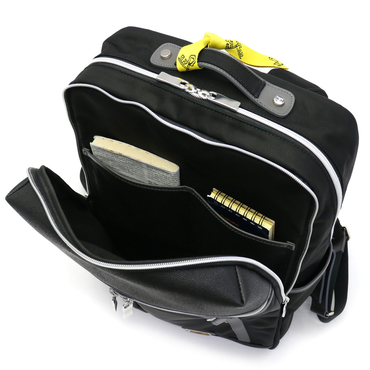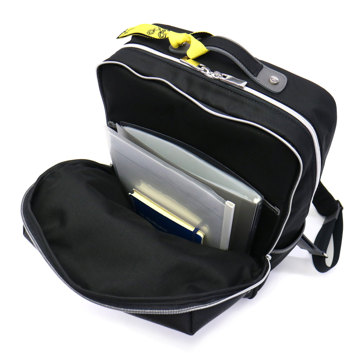 メインルームは、B4サイズに対応した2層構造になっています。前面収納はポケットを2ヶ所装備したシンプルなつくりになっており、分けておきたい書類などの収納におすすめです。背面収納は、マチ幅をしっかりと設け広々としたスペースになっています。内部には小分けに便利なポケットも充実したデザインです。