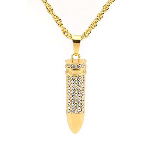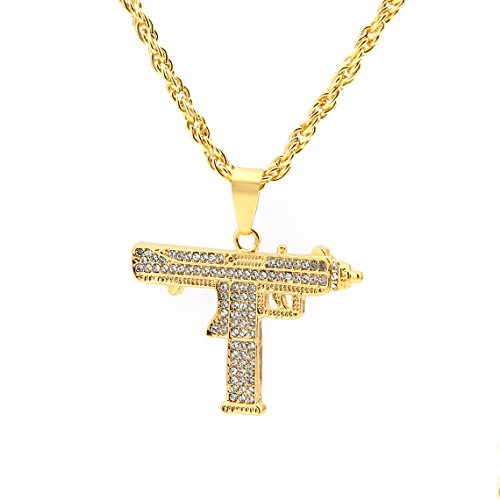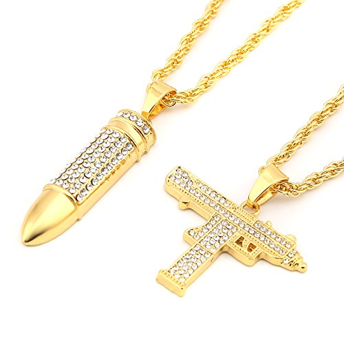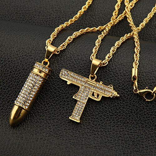 -. Binding : Jewelry -. Brand : HZMAN -. Department : mens -. Feature : Made From Fine Alloy Metal & Plated With Gold Tone Plating / Chain Length:76cm. 30inch. / Chain Width:3mm / As a perfect gift for yourself or friends / Including a beautiful gift box printed with Brand Name "HZMAN". In case you buy it as a gift - you may be sure it looks nice. -. Label : HZMAN -. Manufacturer : HZMAN -. Model : DJ7817 -. MPN : DJ7817 -. PartNumber : DJ7817 -. ProductGroup : Jewelry -. ProductTypeName : FASHIONNECKLACEBRACELETANKLET -. Publisher : HZMAN -. Studio : HZMAN -. Title : HZMAN Mens Gold Two Piece Bullet & Submachine Gun Set Pendant Hip Hop 30" Rope Chain