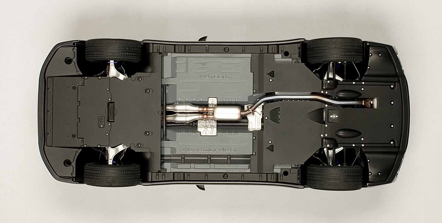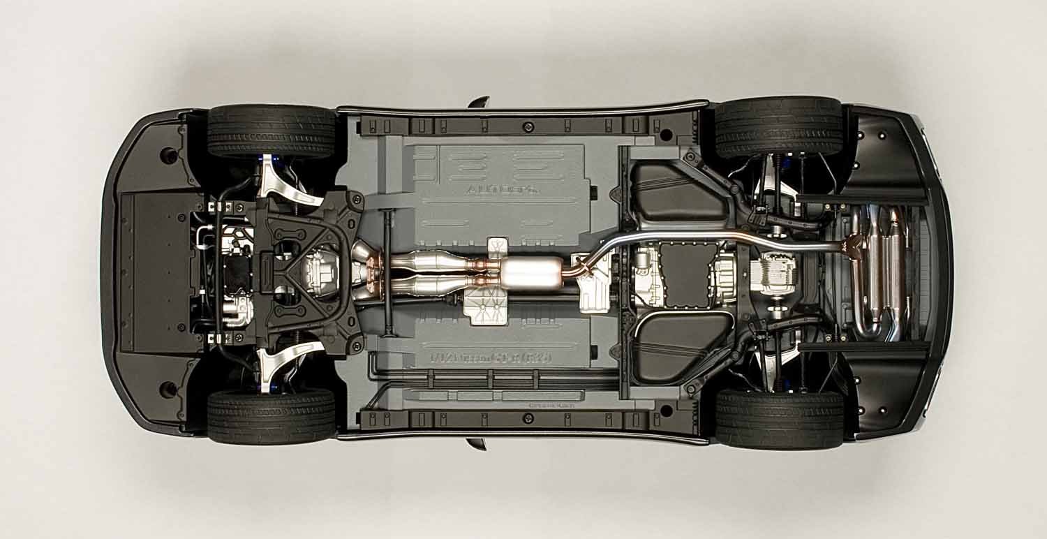 Removing the removable cover on the back of the body, you can appreciate the transaxle 4WD layout, titanium exhaust system, suspension structure etc that you can not see with actual cars.