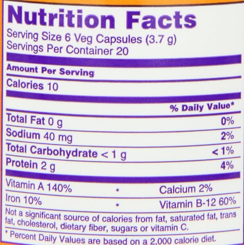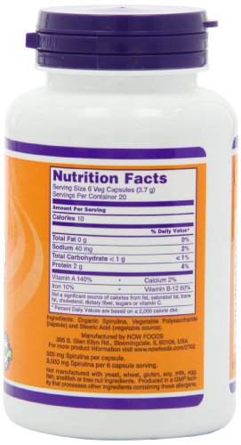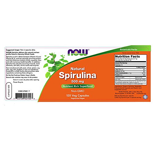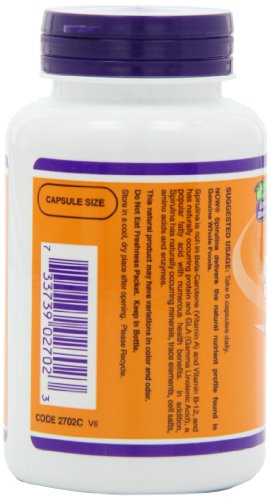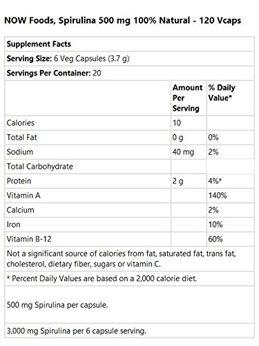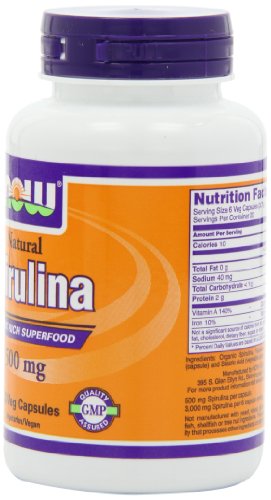ReleaseDate : 2013-05-06 Studio : Now Foods Publisher : Now Foods Binding : Health and Beauty Product Description 100% Natural Nutrient Rich Superfood Grown in Hawaii A Dietary Supplement Vegetarian Formula Spirulina is a single-celled freshwater algae and an incredible source of nutrients.; It provides generous amounts of Beta-Carotene, Vitamin B-12, Iron and Chlorophyll.; Spirulina also provides RNA, DNA and important GLA fatty acids. 0