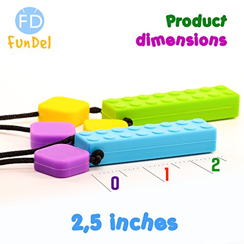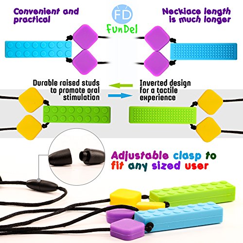 Textured Stimulation and Support The small bumps on each textured "brick" makes these chewable necklace perfect for mild-to-moderate chewers who need consistent stimulation. And because they're food-grade safe and BPA free, they're safe for teeth and gums for long-term safety and use. Promotes Focus, Clarity and Relaxation Great for home, travel, school or daily use, our silicone sensory toys help both boys and girls find relieve from emotional overstimulation. By focusing on the chewing and jaw clenching, they can reliever overwhelming feelings to better find clarity while learning. Long-Term Durability and Strength - Crafted with food-grade safe silicone, our chewable necklaces offer strong resilience for aggressive chewers making them perfect for daily use.