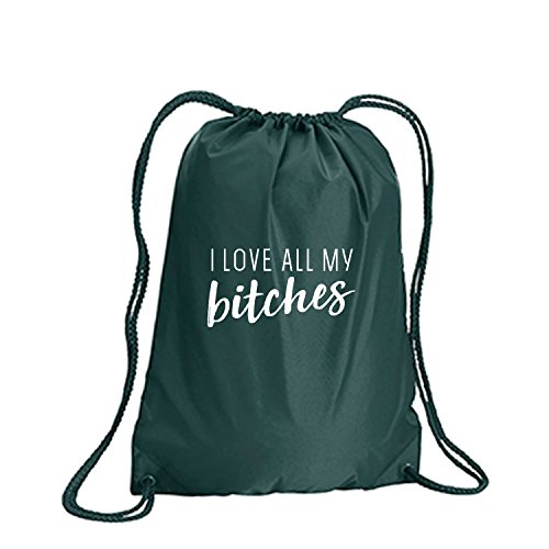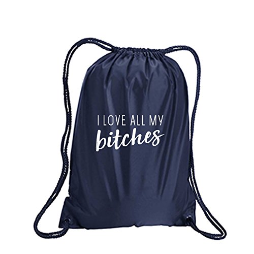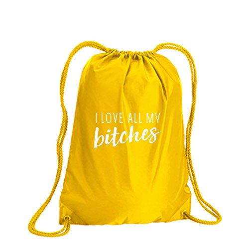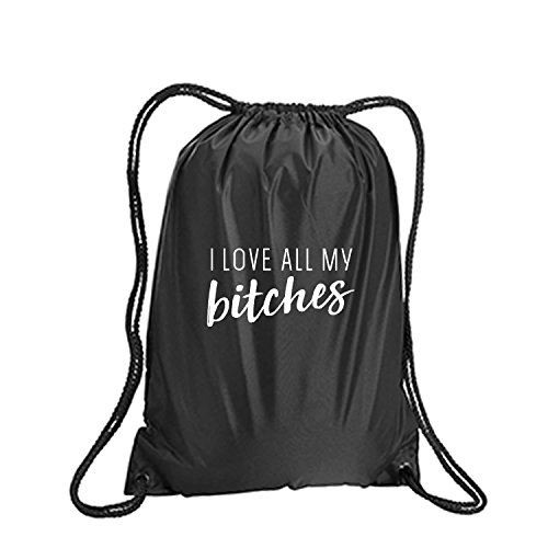 Product Description This durable and stylish nylon tote features "I love all my bitches" on a cinch pack tote with white ink. Bag comes in small and large sizes and is made of a durable 210 Denier nylon and has color-matched draw cords. Printed in the USA on an imported bag. 0