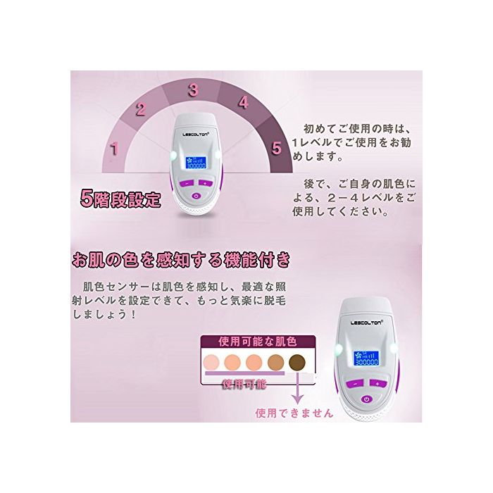 【조사 레벨은 5단계 설정】개인의 기질타입,모질 에 따라 플래쉬의 조사 레벨을 5단계에서 설정에 옵니다.전신의 부위나 털의 굵음 에 맞게 했다, 최적인 탈모 케어 를 할 수 있습니다.또한REAK 가정용IPL탈모기에서는,자동으로 피부의 색이 적용되는 모드를 인식할 수 있고, 더 안심에 탈모로 옵니다.그리고,조작 방법은 간단 안전,피부(기)에 제대로 접촉 하고 있지 않으면 작동 하지 않는 안전 기능을 탑재 하고 있습니다.