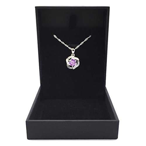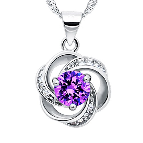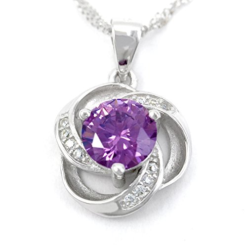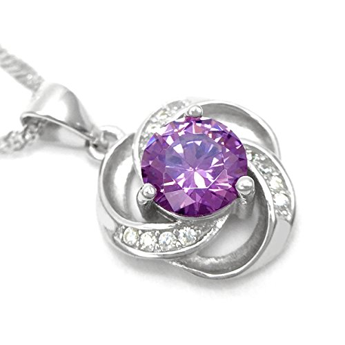 "Shall I compare thee to a summer's day? Thou art more lovely and more temperate." Inspired by one of the most beautiful sonnets of Shakespeare (Sonnet 18), the design of this solid sterling silver necklace features a brilliant cut purple stone set at the centre of a floral pendant. The "petals" are artistically transfigured into three ribbons, each laced with four CZ accents, presenting a wave-like pattern in a poetic way. Our award-winning designer picked purple as the color of the central stone for the connotation the color holds. According to color psychology theory, purple combines the strength of red with the spirituality of blue, a union of body and soul creating a balance between our physical and spiritual energies. Inspiring high ideals, a jewelry with a purple stone is a great choice for someone special in your life, who is gifted with the power of imagination that inspires you to escape mundanity. The chain is 18'' long, perfect length for showing off a V-neck and to highlight the face. Durable and long lasting, the chain won't break when a baby pulls on it. She'll love how the ripple looks and enjoy how it feels laying beautifully on the neck. Add the great necklace to your cart now. The moment she puts it on, she'll feel like the Belle of the Ball on her wedding day.Feature