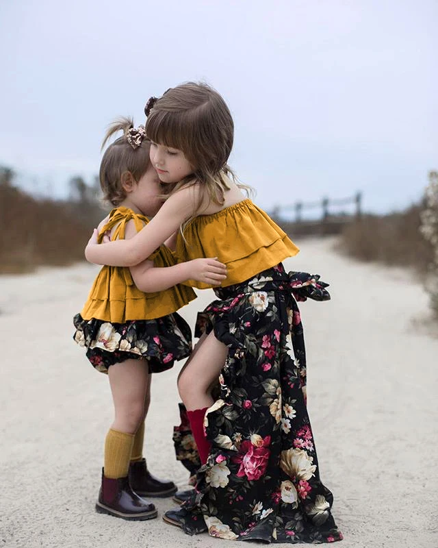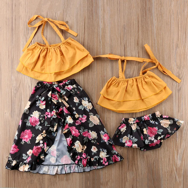 Fashion Sister Match Summer Clothes Set !!! High quality and Brand new 100% Main Color: As The Picture Show New in Fashion Material: Cotton Blend Attentionplz:Ifyourkidischubby」ャwerecomendchoosingalargersize」ャthanks. Please kindly refer to your kids actual height and the size chart before buying/bidding. Thanks. Package included: 1x Crop Tops+1xBaby Bloomers (Little Sister) 1x Crop Tops+ 1x Skirt (Big Sister) Size Chart: