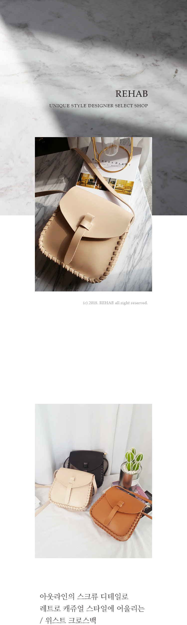 REHABツイストクロスバック表のラインをツイストでポイントを加えてカジュアルスタイルを完成する独特のクロスバックです。製品のつなぎ目を革のストリングで製作してビンテージな感じを演出したミニバックです。彩度の低いカラーで秋と冬スタイルにふさわしい製品です。カラーBlack, Cream-beige, Camel-brownファブリック合成皮革サイズ横 18cm, 縦 21cm, 幅 7cm,ストラップの高さ 53cm