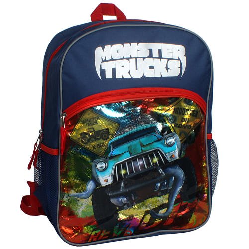 -. Feature : 16X12X5 BACKPACK WITH FRONT ZIP POCKET & 2 SIDE MESH POCKETS / Padded back and straps for extra comfort / Features new Monster Truck Movie Art / FOIL UNDERGLASS W/REVERSE SCREEN PRINT