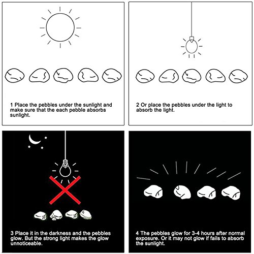 - ➤Eco-friendly with Top Quality Material: These garden glowing pebbles are made of premium resin, very durable, and non-toxic.No need electricity and power, save your money. The glow stones absorb sunlight during the day, light up at night, and they will glow for up to 3 to 4 hours in the dark environment after normal daylight exposure.