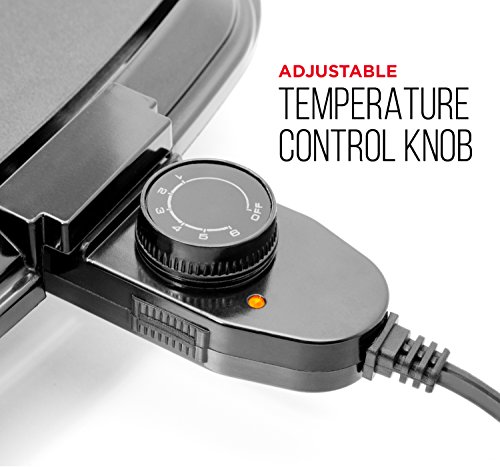 This low-profile unit's 210 sq. Inch cooking surface features a non-stick coating that not only quickly releases even delicate foods such as crepes or fried eggs, but also reduces the need for cooking with excessive oils - resulting in healthier meals, improved textures, and fresher flavors. Equipped with an adjustable temperature control that allows for simply warming foods or cooking raw meats to a safe internal temperature, the griddle also sports cool-touch edges for safe handling and a grease channel with a drip tray. Best of all, cleans up easily by hand or in the dishwasher 0 simply remove the temperature control prior to immersing. Use the electric griddle for supplemental cooking space when entertaining or as an energy-efficient option for everyday family dinners and special weekend breakfasts.Feature