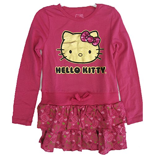 A fancy casual dress with the famous Hello Kitty face printed, a studded bow and glittery texture. The long sleeved dress has a fuchsia printed layered skirt with a little bow at the waist. Your girl will surely enjoy this comfy yet pretty dress.Feature
