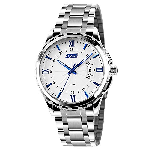 -. Title : Men's Unique Roman Numeral Analog Quartz Waterproof Business Casual Stainless Steel Band Dress Wrist Fashion Calendar Watch with White Dial - Silver Blue
