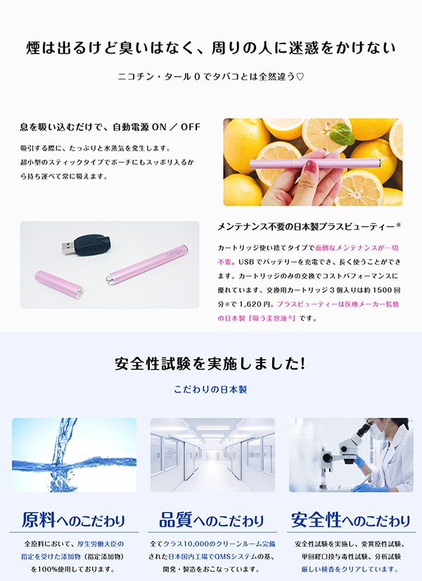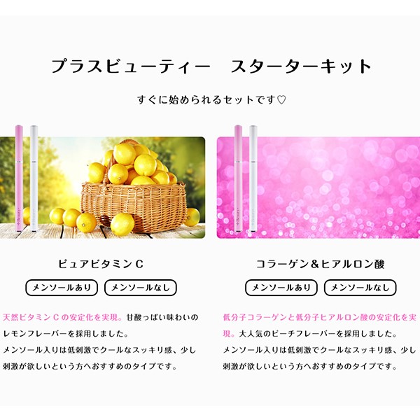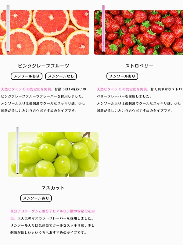 | 種類 | ピュアビタミンC1000 ピュアビタミンC1000メンソール コラーゲン&ヒアルロン酸 コラーゲン&ヒアルロン酸メンソール ピンクグレープフルーツ ピンクグレープフルーツメンソール ストロベリーメンソール マスカットメンソール |