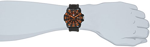 Perfect for low-light or no-light situations, the Luminox Men's Navy SEAL Colormark watch glows 100 times brighter than other luminous watches, which allows for easier visibility. This timepiece This versatile timepiece is constructed with a 44-millimeter polyurethane case and matching durable polyurethane band, which includes a buckle clasp with safety mechanism. Striking orange Arabic numerals contrast with the classic black dial, while smaller orange numerals mark the 24-hour clock. In addition, a handy date calendar rests at the three o'clock position, and the unidirectional, textured, polyurethane bezel features brilliant orange minute indexes for easy readability. Powered by analog-quartz movement and protected by a durable mineral dial window, this watch is preferred by US Navy SEALs and US Air Force Pilots, and is water resistant to a depth of 660 feet.Feature