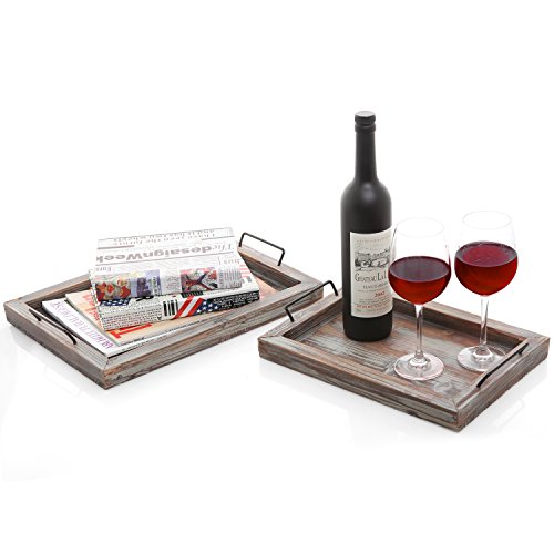 Set of 2 Country Rustic Whitewashed Brown Wood Finish Rectangular Nesting Serving Trays w/ Metal Handles