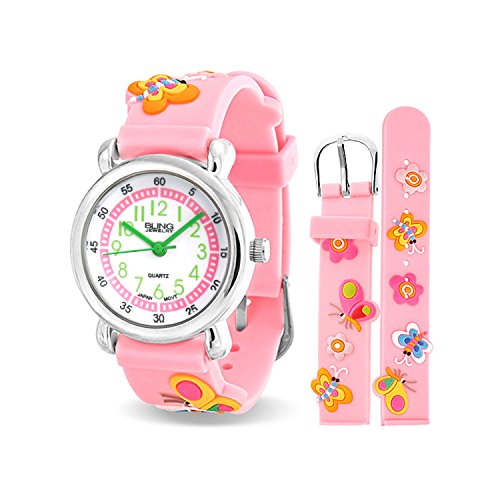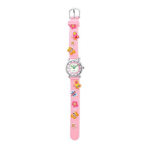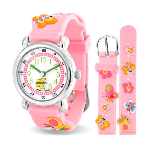 Whether she is just learning to tell time or simply in need of a super cute accessory, your little one will be proud to sport this girls pink butterfly watch. Perfect for your little daughter or niece, this pretty pink butterfly watch will make learning to tell the time both easy and fun. She will be abuzz with excitement from the minute she puts this animal watch on her wrist. Whimsical and fun, our butterfly animal watch is designed on a pink rubber strap. Our analog pink butterflies and flowers animal watch will make learning to tell time easy. The light pink rubber strap of the kids animal watch is filled with with pink, yellow blue and white butterflies and flowers and features a dial with green numbers. The hour, minute and second hands are there to to help her learn to tell time in no time. A butterfly acts as the second hand. The pink rubber strap is made of smooth, soft rubber and will prove very comfortable on her wrist. Since the band is adjustable from from 5 inches to 7 inches, this fun animal watch can also grow along with your child. The 3D pvc strap is durable. Our pink rubber watch boasts palladium nickel plating on the case, a Japanese movement and a stainless steel back for a long lasting life. Order this cute butterfly jewelry today and start her on a lifetime of learning.Feature