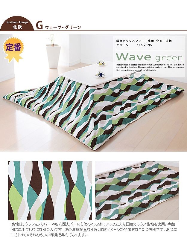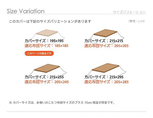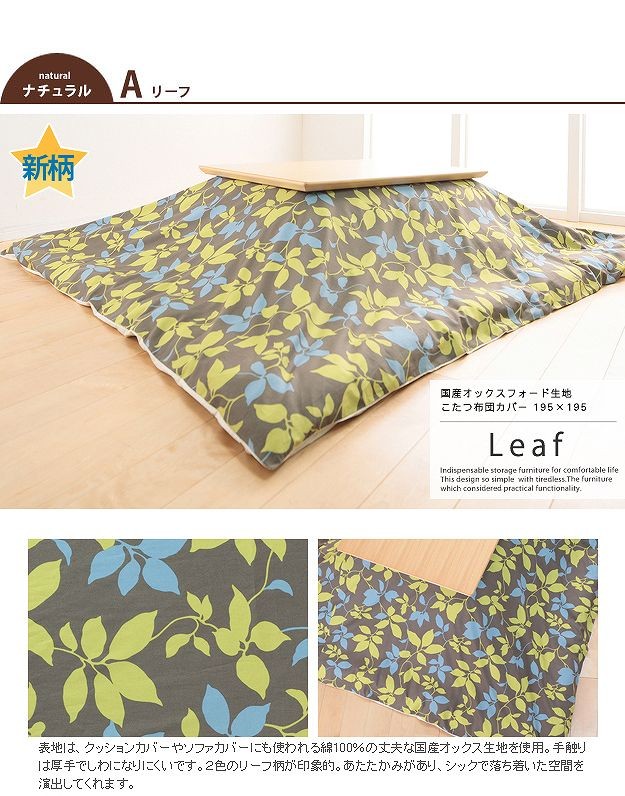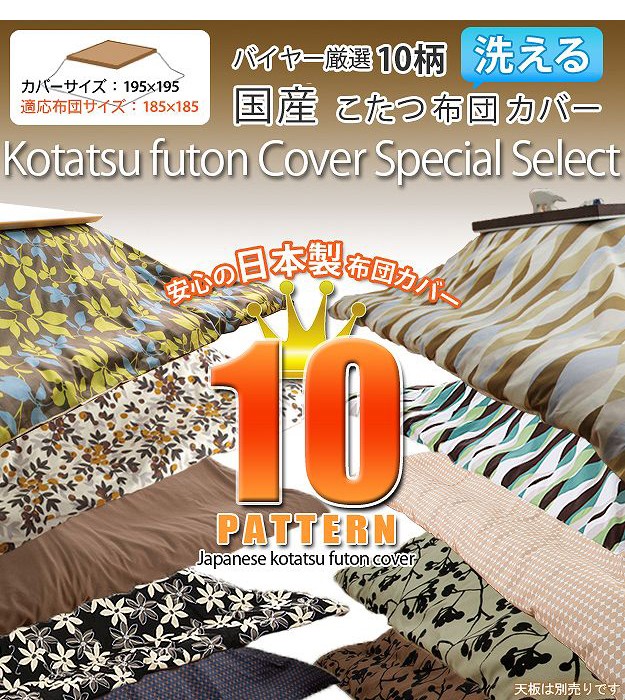 商品について:しわがつきにくく丈夫なオックス生地を使用した日本製のこたつ布団カバー。10パターンのカバーをご用意してますので、お好みを選んで模様替えのアイテムに、こたつ布団のリフレッシュにどうぞ♪ファスナーはカバーの中央についており着脱しやすくなっています。洗濯機丸洗いOKでいつでも清潔にお使いいただけます。四隅に布団とカバーのズレ防止用の留め紐付きです。