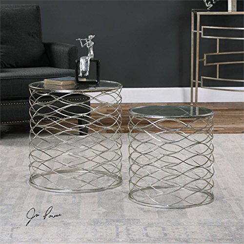 -. Title : 20" Silver Iron Cage Geometric Stretched Oval with Tempered Glass Top Nesting Accent Tables