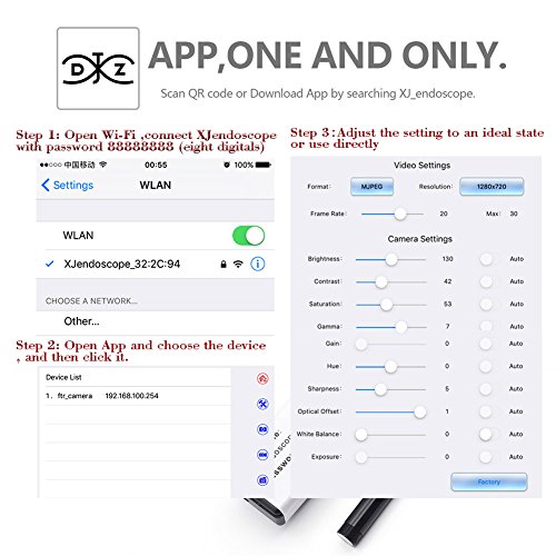 ★ WIFI FUNCTION, MORE CONVENIENT: Just install the endoscope app and sync up with your IOS/Android phone or tablets and then start to your inspection work with live viewing through WIFI. (Application Fields: motor vehicle detector; sewer pipeline detector; search and rescue; archaeological detect; PCB detection; home care; underwater Micro-cameras; aviation and space industries; care and tractors industries; petroleum drilling industries; constructions; criminal and custom detector and so on.)
