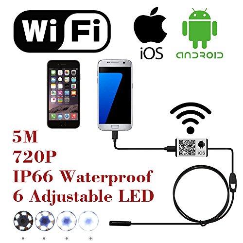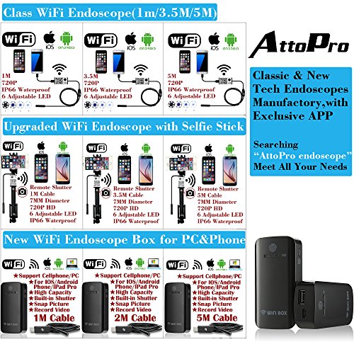 ★ EQUIPPED 5M CABLE. We also produce 1M & 3.5M version,you can find them on our store.If you have any confusion about how to use before buying, please watch the video about wifi endoscope on Youtube. What is wifi endoscope, how to use, what’s the difference. Link: https://www.youtube.com/watch?v=7fIVAEEdacQ