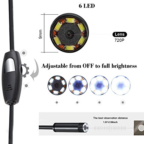 ★ ALL-IN-ONE: 2 Megapixels CMOS Camera;Up to 1280 x 720 HD high quality images;62 degree viewable angle; IP66 waterproof probe and 9mm diameter camera head; Built-in 6 white bright LED lights; Adjustable brightness from OFF to full brightness will improve visibility in low-light or dark environment,ideal for inspection of inaccessible area or not viewable area.